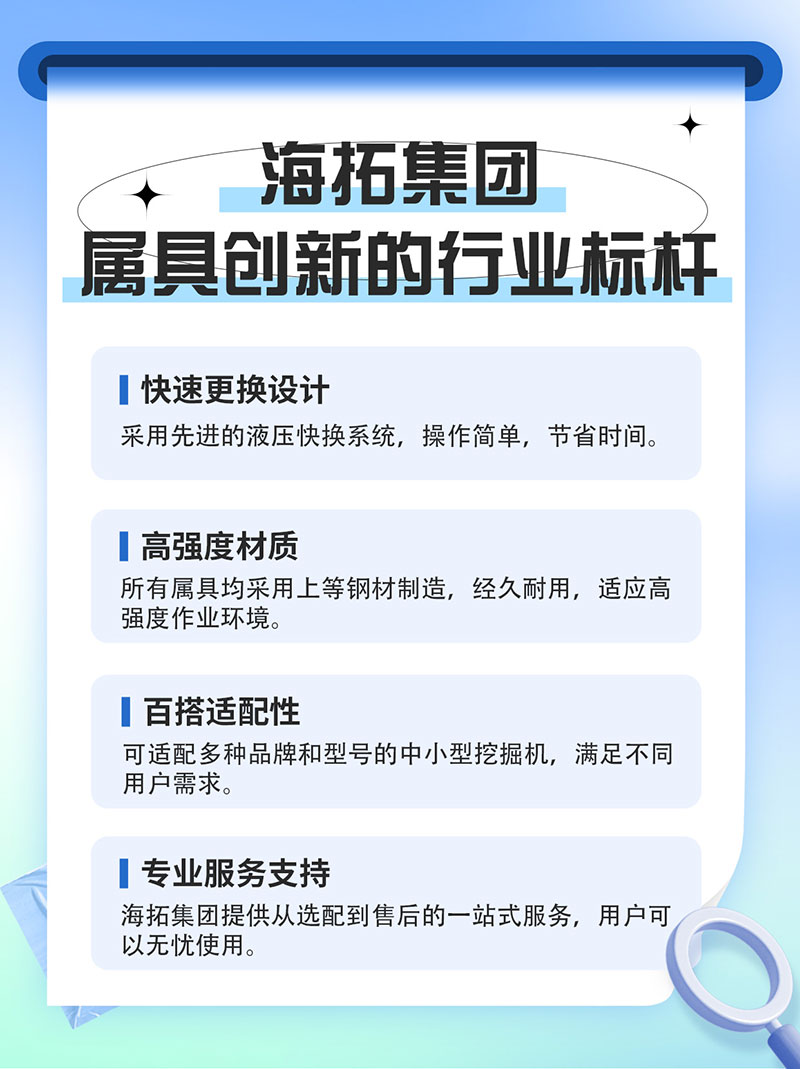 作為工程機(jī)械領(lǐng)域的深耕企業(yè),海拓集團(tuán)長(zhǎng)期致力于中小型挖掘機(jī)及其配套屬具的研發(fā)與制造。其產(chǎn)品以高適配性、高耐用性和高性?xún)r(jià)比著稱(chēng),廣泛應(yīng)用于市政、園林、農(nóng)業(yè)等多個(gè)領(lǐng)域。此外,海拓提供完善的售后服務(wù)和技術(shù)支持,確保設(shè)備在各類(lèi)工況下穩(wěn)定運(yùn)行。
