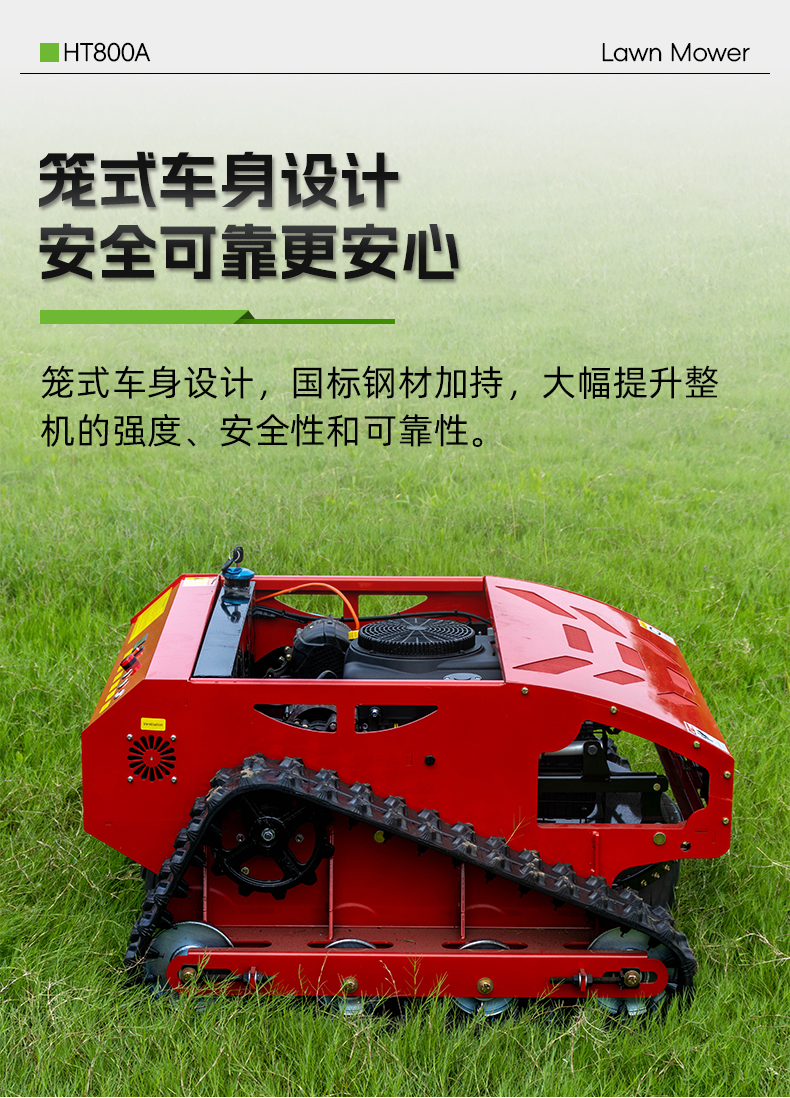 HT800A遙控割草機籠式車身設計,國標鋼材加持,大幅提升整機的強度、安全性和可靠性。