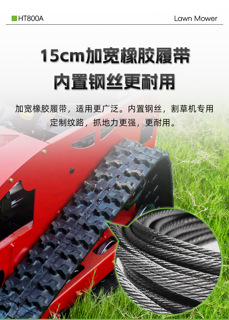 加寬橡膠履帶,適用更廣泛。內(nèi)置鋼絲,割草機專用定制紋路,抓地力更強,更耐用。