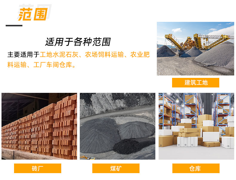 主要適用于工地水泥石灰、農(nóng)場(chǎng)飼料運(yùn)輸、農(nóng)業(yè)肥料運(yùn)輸、工廠車間倉(cāng)庫(kù)。