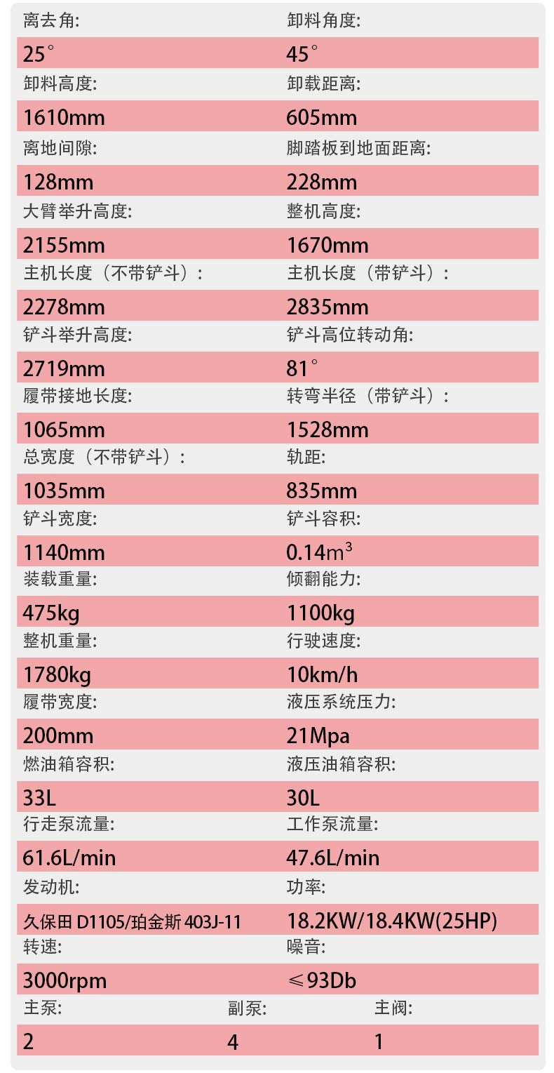 搭載久保田D1105或珀金斯403J-11知名品牌發(fā)動機,額定功率可達18.2KW/18.4KW(25HP),3000rpm的轉(zhuǎn)速確保動力持續(xù)穩(wěn)定輸出。21Mpa的液壓系統(tǒng)壓力配合47.6L/min的工作泵流量、61.6L/min的行走泵流量,讓大臂舉升、鏟斗翻轉(zhuǎn)等動作響應(yīng)迅速、動力充沛。雙主泵+一副泵的液壓配置,進一步提升了作業(yè)效率,輕松應(yīng)對高強度連續(xù)作業(yè)需求。