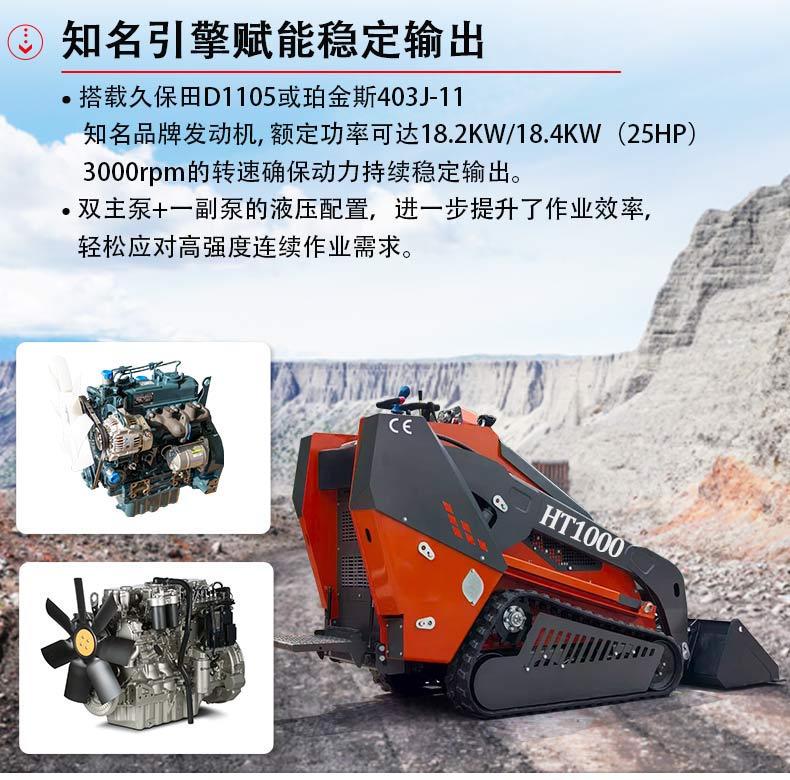 HT1000滑移裝載機以硬核參數(shù)打造高效作業(yè)體驗,搭載0.14m3容積鏟斗,配合1100kg的強勁傾翻能力與475kg裝載重量,輕松應(yīng)對中小型裝載、轉(zhuǎn)運需求。